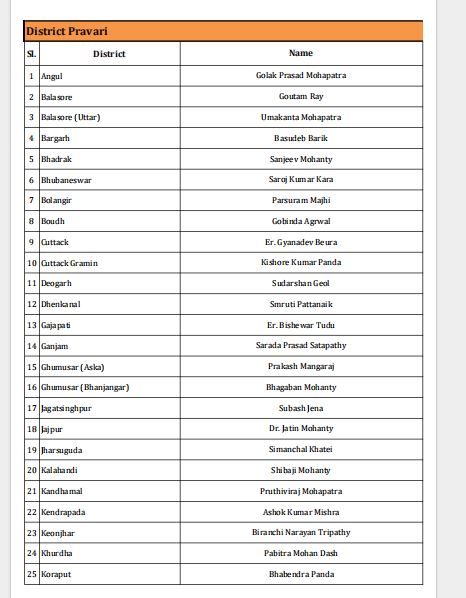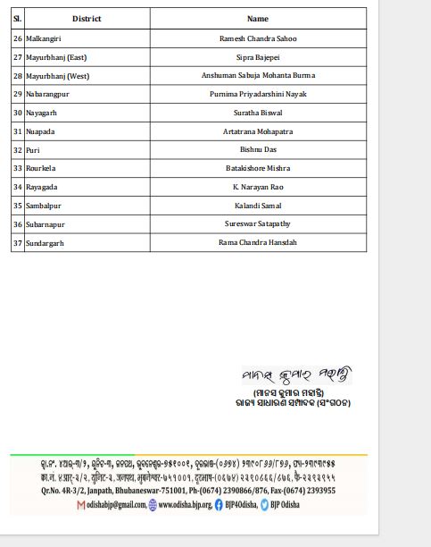 ଭୁବନେଶ୍ୱର,: ଭାରତୀୟ ଜନତା ପାର୍ଟି(ଭାଜପା) ପକ୍ଷରୁ ମଙ୍ଗଳବାର ବିଭିନ୍ନ ଜିଲା ପାଇଁ ମୋର୍ଚ୍ଚା ସଭାପତି, ଜିଲା ପ୍ରଭାରୀ ଏବଂ ଅନ୍ୟାନ୍ୟ ନାମ ଘୋଷଣା କରାଯାଇଛି। ଅଭିଳାଷ ପଣ୍ଡାଙ୍କୁ ଭାରତୀୟ ଯୁବ ମୋର୍ଚ୍ଚା ସଭାପତି ଏବଂ ଡ. ଐଶ୍ବର୍ଯ୍ୟା ବିଶ୍ବାଳ ମହିଳା ମୋର୍ଚ୍ଚା ସଭାପତି କରାଯାଇଛି। ରାଜ୍ୟ ଭାଜପା ସଭାପତି ମନମୋହନ ସାମଲଙ୍କ ଅନୁମୋଦନ କ୍ରମେ ୭ ଜଣଙ୍କୁ ମୋର୍ଚ୍ଚା ସଭାପତି, ୩ ଜଣଙ୍କୁ ଭାଜପା ସେଲ୍ ଇନ୍ଚାର୍ଜ, ଜଣଙ୍କୁ ଅଫିସ୍ ସେକ୍ରେଟାରୀ, ଜଣଙ୍କୁ ଆଇଟି ଦାୟିତ୍ୱ ଏବଂ ୩୭ ଜଣଙ୍କୁ ବିଭିନ୍ନ ଜିଲାର ପ୍ରଭାରୀ ଭାବେ ଦାୟିତ୍ୱ ଦିଆଯାଇଛି।