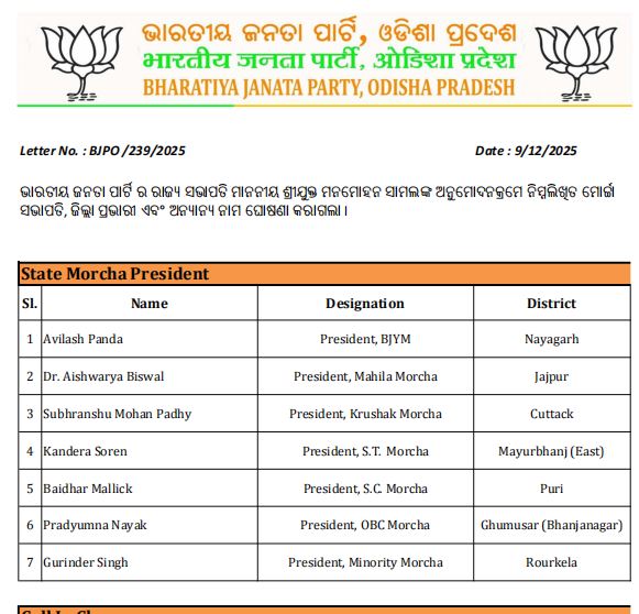 ମୋର୍ଚ୍ଚା ସଭାପତି ଘୋଷଣା କଲା ଭାଜପା